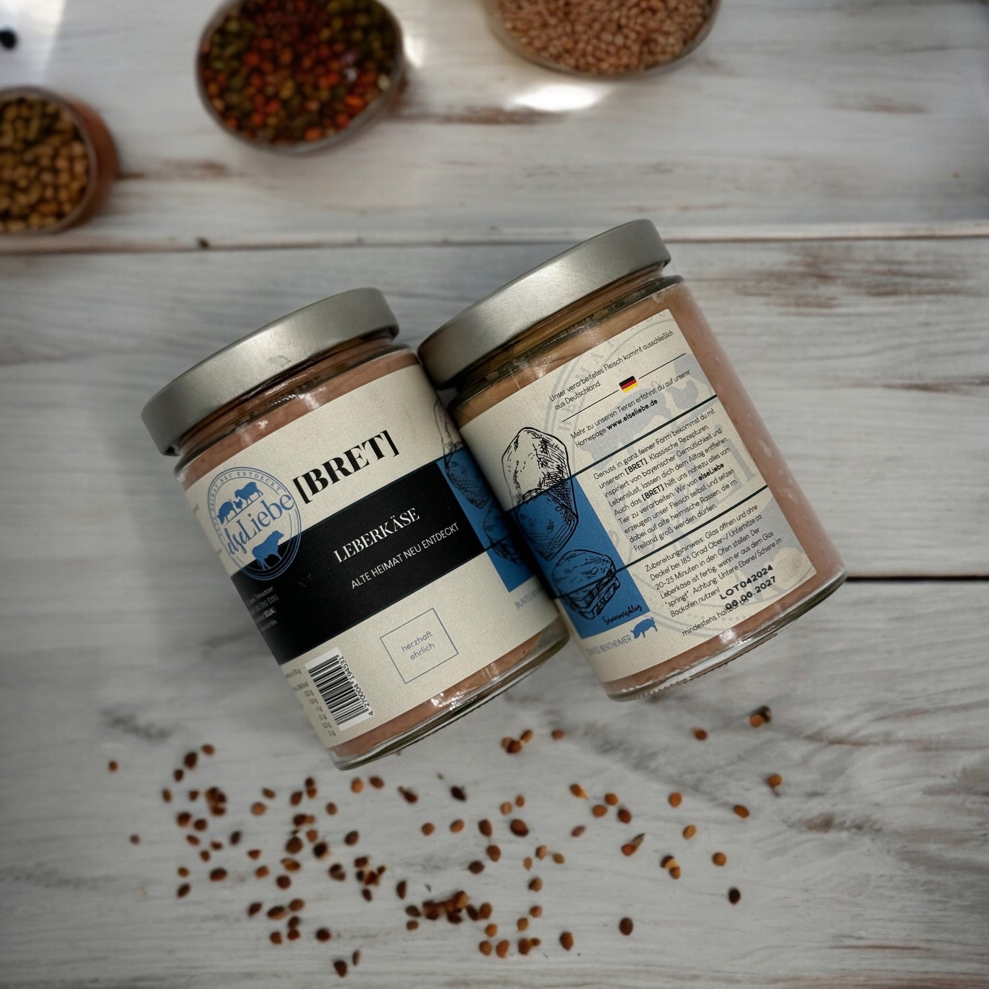 Das [BRET] hilft uns das etwas "Mehr" an Fett unserer Bunten Bentheimer Schweine zu verarbeiten. Wir haben hier einen Leberkäse im Glas gemacht, der eigentlich als Fleischkäse bezeichnet wird, da hier keine Leber verarbeitet wird. Die ist in unsere [WURST] gegangen, die Ihr hier findet.
