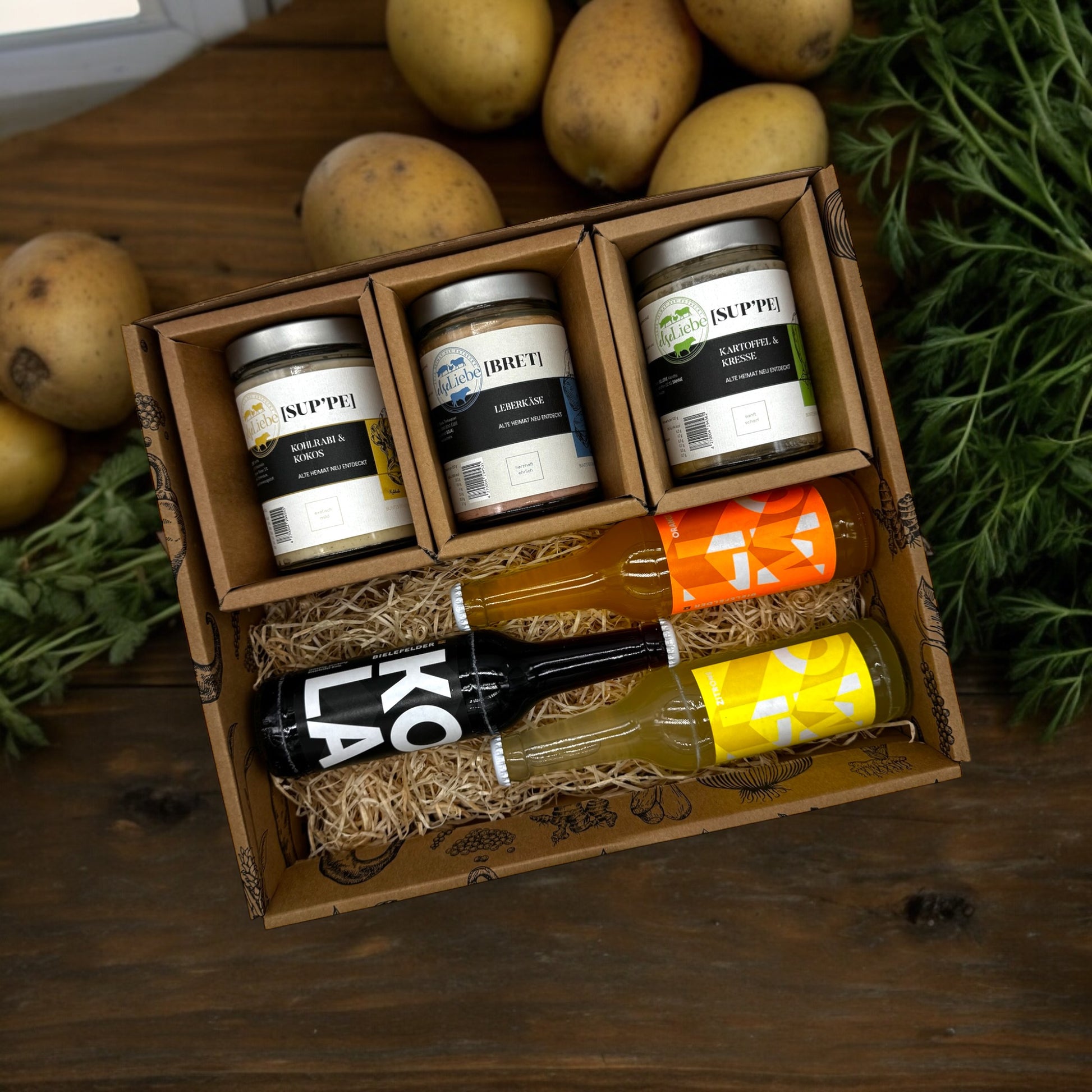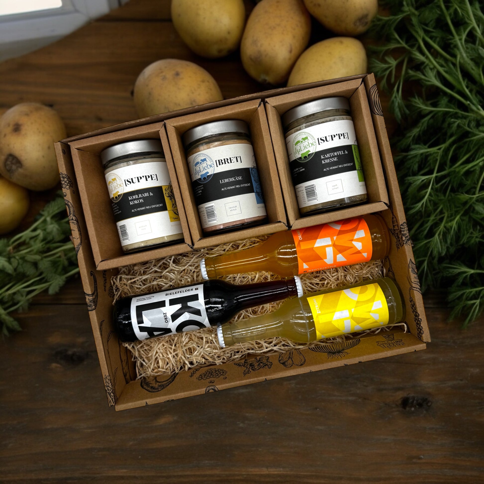 Diese Genussbox ist ideal, um so richtig bewusst zu genießen und das ganz ohne Alkohol. Eine große Box mit 2x [SUP'PE], 1x [BRET] Leberkäse und drei Flaschen 0,33l Softdrinks.