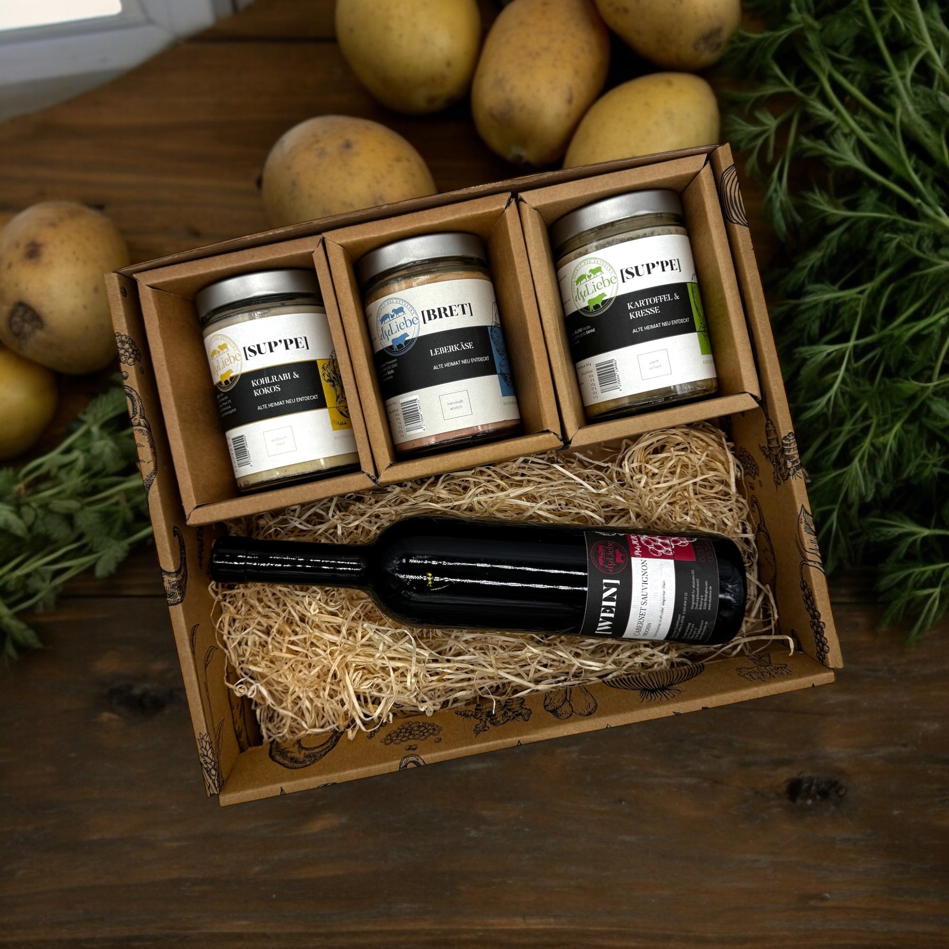 Diese Genussbox ist ideal, um so richtig bewusst zu genießen. Eine große Box mit 2x [SUP'PE], 1x [BRET] Leberkäse und einer Flasche [WEIN].