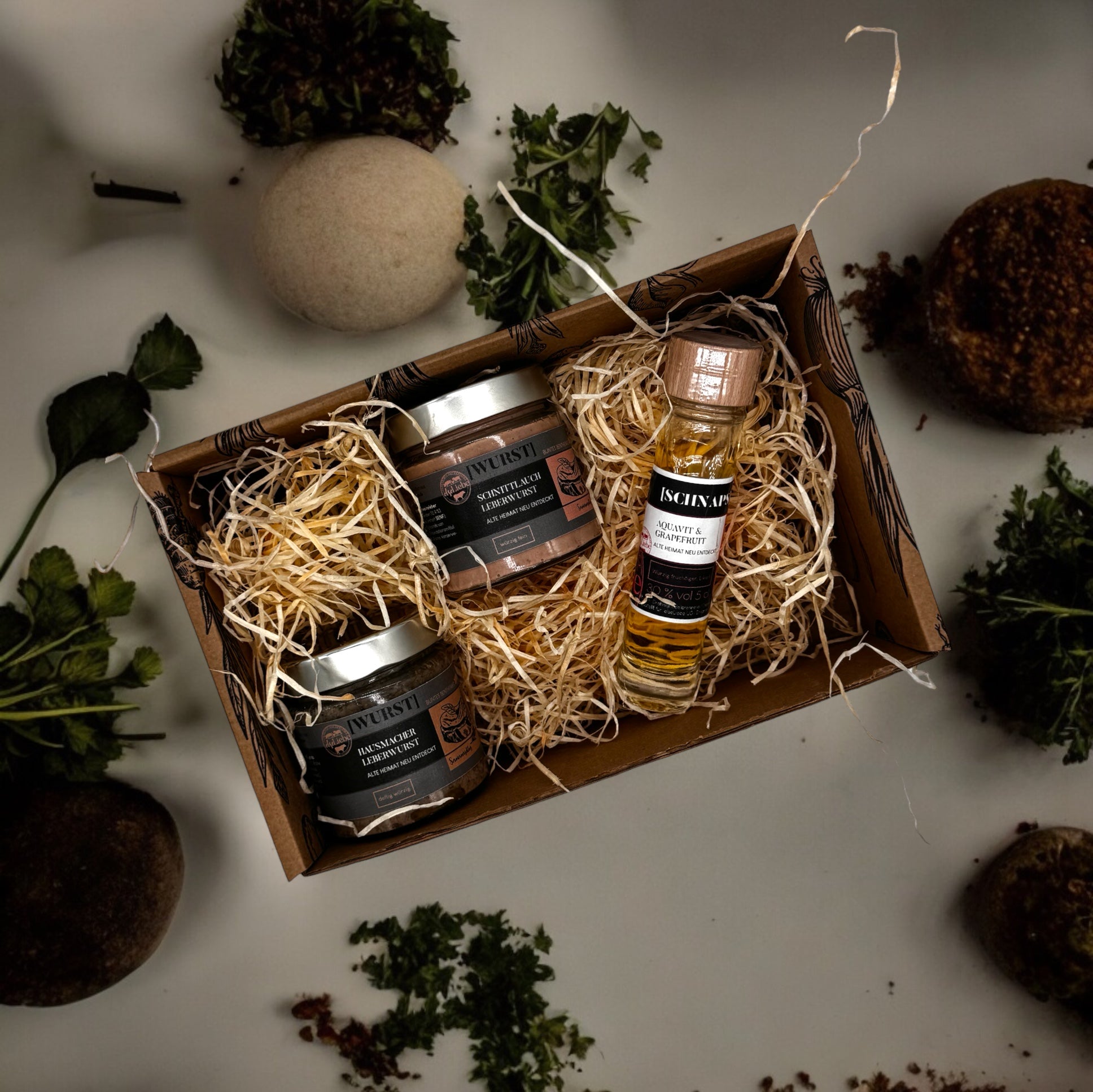 Diese Genussbox ist ideal, um eine deftige Brotzeit mit einem besonderen Getränk abzurunden. Eine kleine Box mit zwei Sorten [WURST] und einem kleinen [SCHNAPS]. Zum einen ist das unsere Hausmacher Leberwurst (180g), die traditionell ohne Nitritpökelsalz hergestellt wird und eine etwas gröbere Struktur aufweist. Zum anderen ist das unsere Schnittlauch Leberwurst (170g), die fein gekuttert, mit Schnittlauch verfeinert, klassisch abgeschmeckt ist. Das Fleisch kommt von unseren Bunten Bentheimer Schweinen, die bei uns im Freiland groß werden dürfen. Wenn du mehr Infos dazuhaben willst, schau mal bei bauer_hairy auf Instagram vorbei.